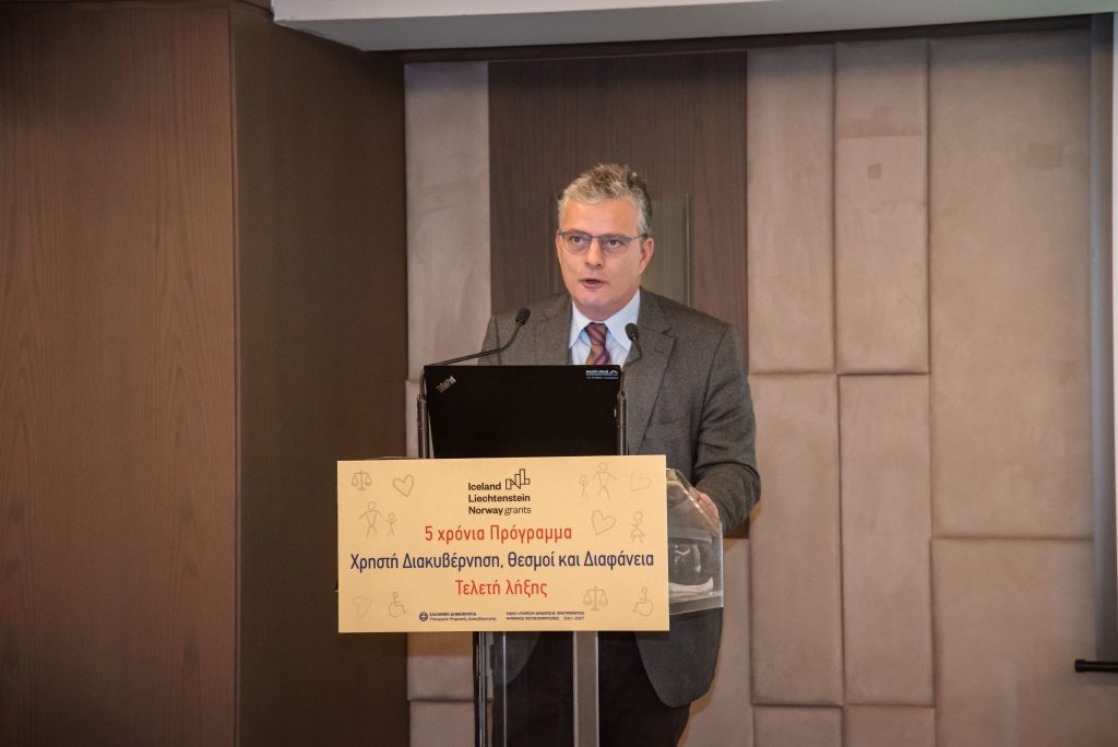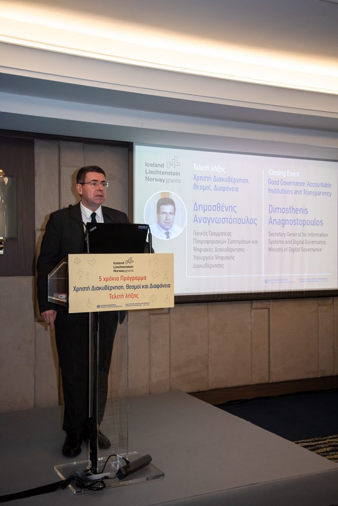 Ο Γενικός Γραμματέας Πληροφοριακών Συστημάτων και Ψηφιακής Διακυβέρνησης – Υπουργείο Ψηφιακής Διακυβέρνησης, κ. Δημοσθένης Αναγνωστόπουλος αφού ευχαρίστησε τις Δότριες χώρες και όλους τους συμμετέχοντες στην υλοποίηση του προγράμματος, τόνισε μεταξύ άλλων ότι η εμπιστοσύνη στους θεσμούς είναι το ζητούμενο και μέσω του προγράμματος αυτή ενισχύθηκε σε σημαντικό βαθμό. Στάθηκε ιδιαίτερα στο θέμα της λογοδοσίας και διαφάνειας λέγοντας ότι το πρόγραμμα πέτυχε την ενίσχυση του διαλόγου μεταξύ πολιτών και Δημοσίου, με συνεπακόλουθο την αύξηση της εμπιστοσύνης των πρώτων προς το δεύτερο.