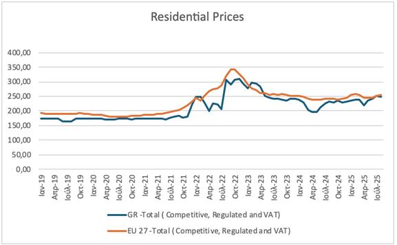 Σύγκριση λιανικών οικιακών τιμών Ελλάδας με τον Μέσο Όρο της Ευρωπαϊκής Ένωσης (2019-2025)